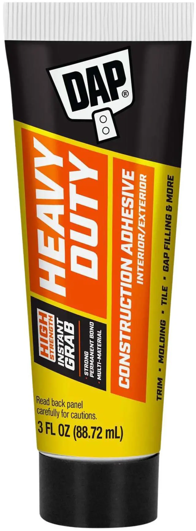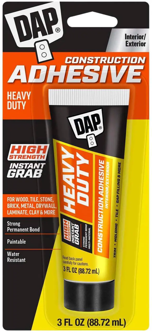 DAP Heavy Duty Construction Adhesive is a high-strength, instant grab adhesive designed for tough interior and exterior projects. With powerful instant grab, it eliminates the need for nailing, bracing, or clamping on vertical applications, holding materials in place immediately. This adhesive forms a durable, long-lasting, weather-resistant bond on a wide range of materials, including wood, tile, stone, brick, metal, and more. It remains repositionable for up to 10 minutes, is paintable, and offers easy water cleanup. Low odor and VOC compliant, its ideal for a variety of demanding repairs. Country of Origin: United States.