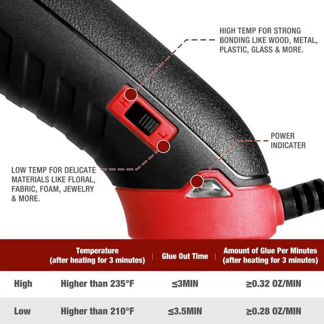 High & Low Temperature Settings: This glue gun has high and low temp settings, making it suitable for a wide range of projects. Whether you're working with heavy-duty materials that require maximum bonding or delicate craft materials that require a lower temperature, this glue gun has got you covered