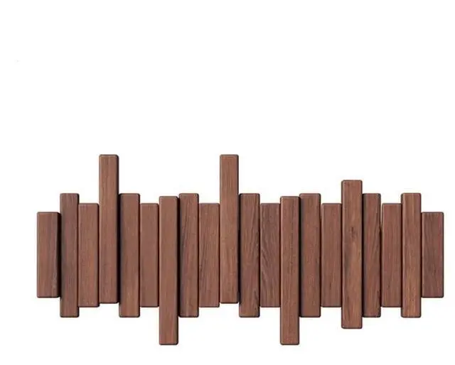 This exquisite wall-mounted coat rack seamlessly blends form and function, bringing a refreshing transformation to your hallway or bedroom. Its striking contemporary design features a dynamic array of wooden slats, serving both as an artistic focal point and a practical storage solution. Crafted in rich dark wood, the decorative hook rack exudes warmth, infusing any space with contemporary style. The staggered grid height creates a three-dimensional visual effect while offering multi-tiered hanging space for effortlessly storing coats, bags, scarves, and accessories. Sleek lines maintain orderly organisation, with minimalist aesthetics complementing modern home décor. Its robust construction ensures reliable, everyday durability, while clean lines and premium texture make it a striking decorative feature even when not in use. This versatile rack is ideal for organising hallways, utility rooms or bedrooms, maximising vertical storage space while adding architectural interest to walls. Please note: fixing accessories are required for installation (not included).