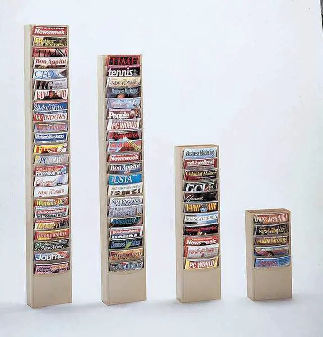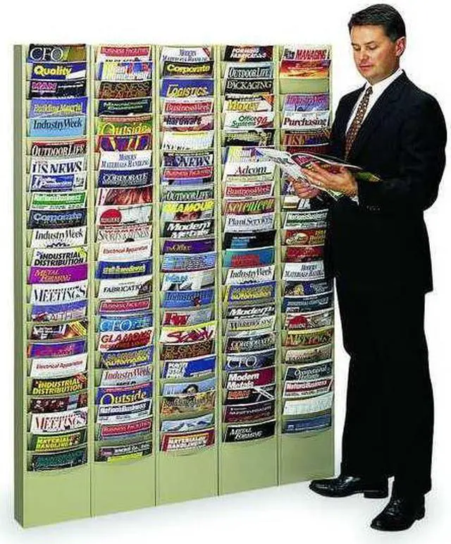 Magazine Display, Vertical, Construction Steel, Height 65 1/2 in, Width 9 3/4 in, Depth 4 1/8 in, Color Tan, Number of Compartments 23. This item has been restricted from sale in the following state (s): []