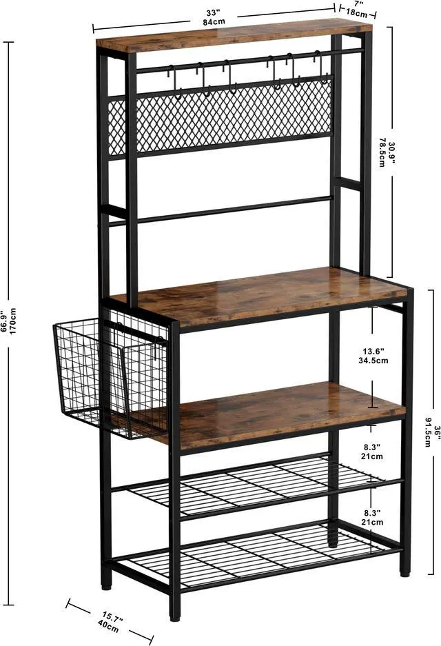 IRONCK Kitchen Furniture -Space-saving Convenient Stylish! This Baker's Rack will expand your storage space remodeling your kitchen, which is a perfect solution to help get you more of that much-needed space. Constructed by metal and wood adds an industrial flair that emphasizes the rustic appeal. IRONCK Kitchen island supports with a top-shelf, a mesh panel and 2 hanging rods, a spacious tabletop, 4 tier shelves, a wire basket, and 6 sliding hooks.