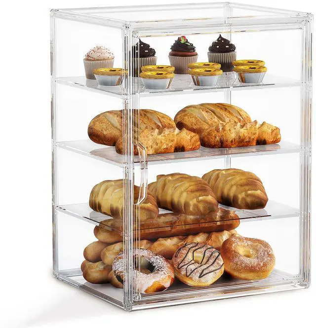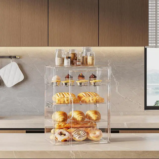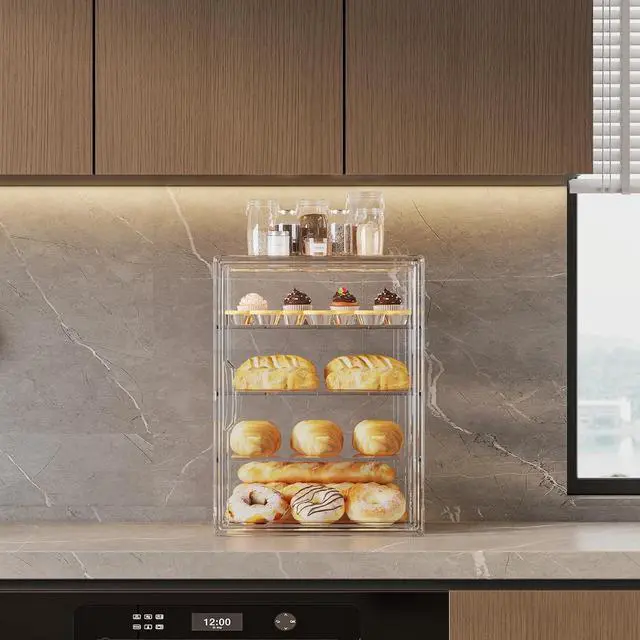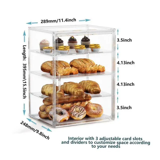 4-Tier Pastry Display Case, Large Bread Box for Kitchen Countertop, Adjustable Bread Storage Container, Bakery Display for Bread, Cookies, and Donuts, Size 15.5 * 11.4 * 9.8 Inch