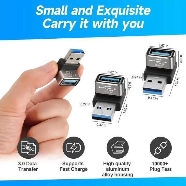 Up&Down Left&Right 90 Degree AngleThese 4 angle adapters can change the direction of the USB port by 90 degrees to any angle allows the cable to have a suitable direction which can avoid the wear of the input port of the device prolong the service life. High Speed ChargingThe adapter supports the maximum 5V/3A 15W power delivery providing your device with the fastest possible charging. 5Gbps Data TransferThe USB 3.0 adapter can provide data transfer speed up to 5 Gbps. Plug and play no additional drivers needed. Small and PortableUltra thin size ultra compact design durable aluminum shell fine appearance details and strict quality inspection standards.
