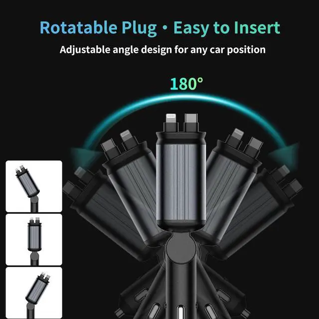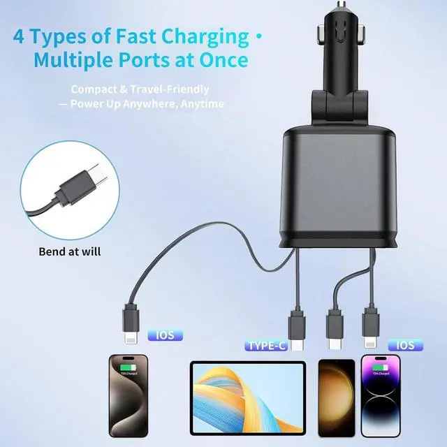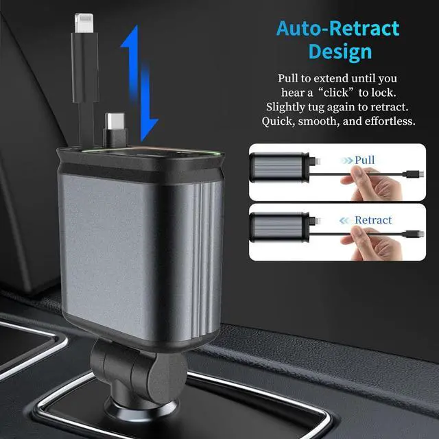 66W Dual-Port Fast Charging Supports USB-C PD & USB-A QC 3.0 delivering 66W max output. Charge two devices at top speed ideal for long drives and busy days. 4-in-1 Retractable Cable Design Comes with built-in Type-C and Lightning cables that retract smoothly with a simple pull. No tangles no messjust grab and go. Stylish Starlight LED Light Elegant ambient lighting makes it easy to locate the charger in low-light conditions without distracting the driver. Universal Compatibility Works with iPhone 16/15/14/13/12/11 Pixel iPad and more. Covers almost all USB-C and Lightning devices. Smart & Safe Charging Advanced chip offers full protection from overheating overvoltage and short-circuit ensuring stable charging for all your devices.