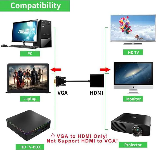 IMPORTANT NOTE: This adapter CAN NOT be used as a HD-to-VGA converter. Please know that the product is not defective! It's just only work for VGA to HD!!! Please be aware before ordering!!! Portable VGA-to-HD Adapter/Converter easily hook up old computer/laptop with VGA output to new TV monitor or projector with HD input for video streaming game playing screen mirroring or extending. VGA output/HD input supports support video and audio synchronously video resolution up to 1920x1080@60Hz (1080P full HD) transmit stereo sound of the video via the 3.5 mm aux jack. Plug and Play but the micro USB port MUST be connected to get power for the build-in active VGA-HD chipset (not working at all if not connected). Compatible with Windows 7/8/10/11 Linux OS operating system. Package included a 15 pin D-sub (VGA) to HD adapter a 3.5 mm jack Audio Cable and Micro USB Power Cable. If the product you received did not work or suddenly stop working please contact us immediately via Message to get refund or replacement! Herfair offers 30 days free return and 18 months warranty to all our products!