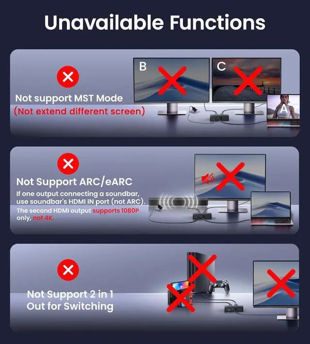 Unavailable Functions: 1. This HDMI splitter does not support extended display it can only mirror the same screen on both monitors. 2. It does not support ARC/eARC. If one output connects to a soundbar make sure to use the soundbars HDMI IN port (not the ARC port). In this case the second HDMI output supports 1080P only not 4K. 3. This device cannot work as an HDMI switcher it only supports one input source at a time.