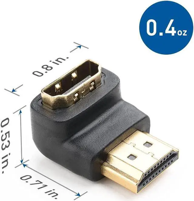 Low-profile HDMI adapter connects an HDMI cable to a computer media streamer stick Blu-ray player wall-mount UHD TV monitor or projector with HDMI input; Connect to an HDMI port with little clearance behind your displayHDMI angle adapter with a 90 degree elbow functions as an HDMI right angle adapter or an HDMI left angle adapter; Direct the cable up or down depending on the orientation of the HDMI port on your equipment; HDMI cable adapter extends less than 1 inch from the HDMI port to connect a wall mount TVVideo resolution support up to full 4K including 4096x2160 3840x2160 2560x1600 2560x1440 1920x1200 and 1080p; HDMI 2.0 compatible with HDMI support for Audio Return Channel (ARC) HDMI Ethernet Channel (HEC) 48 bit color depths 32 channel audio Dolby True HD 7.1 audio and 3D video; HDCP compliant for viewing content protected videoPort saver reduces strain on the HDMI port of equipment or displays such as a computer monitor or TV; Easily connect a FireTV stick to your TV with this lightweight 90 degree HDMI adapterSuperior construction of 90 angle adapters combines gold-plated connectors with an easy-grip surface for reliable signal transmission and easy installation; A lifetime warranty is included with these HDMI elbow adapters for peace of mind when purchasing