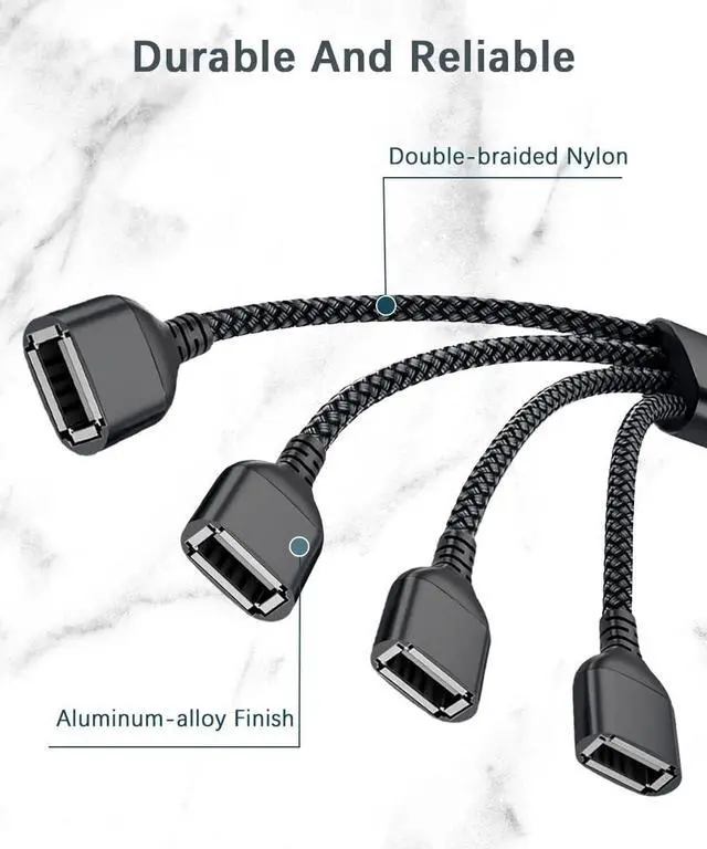 (The Catch) No product is perfect neither is this one. The rated voltage and current is 5V and 2A for this adapter meaning each sub-cable of this adapter gets 0.5A when they are used at the same time. For more info refer to the detailed description down below. (Less Constraint More Freedom) Need more USB-A ports because all the new gadgets are coming with fewer off them? This USB-A to four-port USB-A splitter could just be your life-saver. Add more USB-A ports to your device so that you and your talent don't have to be confined by the single-port dilemma (Notice: This is a USB 2.0 splitter). (Less Wearing More Saving) Tired of your wallet constantly getting worn and becoming thinner along with the wearing of other shoddy splitters? With double-braided nylon and aluminum casing that is not sensitive to twists and bends this cable can last longer than you can imagine. (Less Confusion More Concentration) With no need to download and install extra drive you can simply plug this splitter in your device and start using it right away. No confusing configuration no time-consuming adjustments. It's easy to stay focused with this splitter. (Less Chaos More Order) Need to simultaneously connect to your accessories like keyboard and mouse but don't want too many cables to mess up your working space? Now you can. This splitter makes it possible to connect to four devices with one single cable so that you are free from all the hassle from tangled cables.