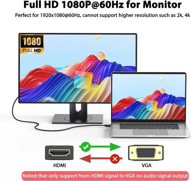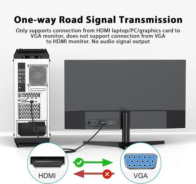 Durable: Our hdmi to vga cable use gold-plated interface light structure design and braided cable to ensure the stable transmission and longlasting using. It is NOT a bi-directional converter and cannot transmit signals from VGA to HDMI.