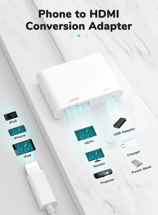 1080P iPhone to HDMI Adapter for TVTransform your TV into a bigger screen with this Lightning to HDMI Adapter Cable. Mirror your iPhone or iPad display in stunning 1080p HDperfect for apps presentations videos slideshows and more. Works seamlessly with HDMI-compatible TVs monitors projectors and displays. Plug & Play No Setup RequiredSimply connect the adapter and it will instantly mirror your device's display onto a larger screen. No additional apps AirPlay drivers WiFi or Bluetooth connections are required. Although it operates without needing external power connecting it to a power source is recommended to avoid draining your phone's battery during use.