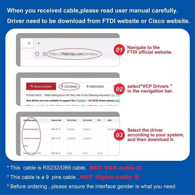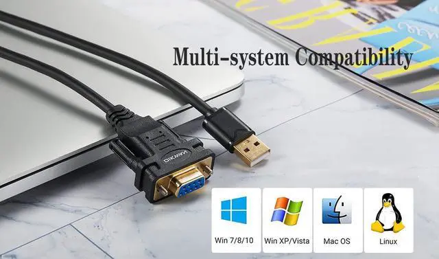 NOTE: It's USB to RS232 FEMALE adapter (It's NOT 15 pin VGA Monitor Cable)9 pin to usb adapter built with the Industry Leading FTDI Chip supports Windows 10/ 8.1 /8/7/Vista/XP//2000 /Linux 2.4 or above Mac OS X 10.6 and above; Drivers can be downloaded at FTDI website. USB to RS232 adapter works with modems ISDN Terminal Adapters digital cameras label writers palm PCs PDAs cashier register CNC PLC controller tax printer POS bar code label printer and devices with
