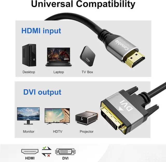Universal Compatibility: The HDMI to DVI cable is compatible with all HDMI or DVI-D 24+1 24+5 equipped devices. Suitable for Computer PC Desktop Laptop Raspberry Pi Xbox Wii U Set Top Box PS3 PS4 Graphics Card TV TV Box DVD to your DVI-equipped HDTV Monitor Projector; or connect DVI-equipped source devices to HDMI-enabled devices.