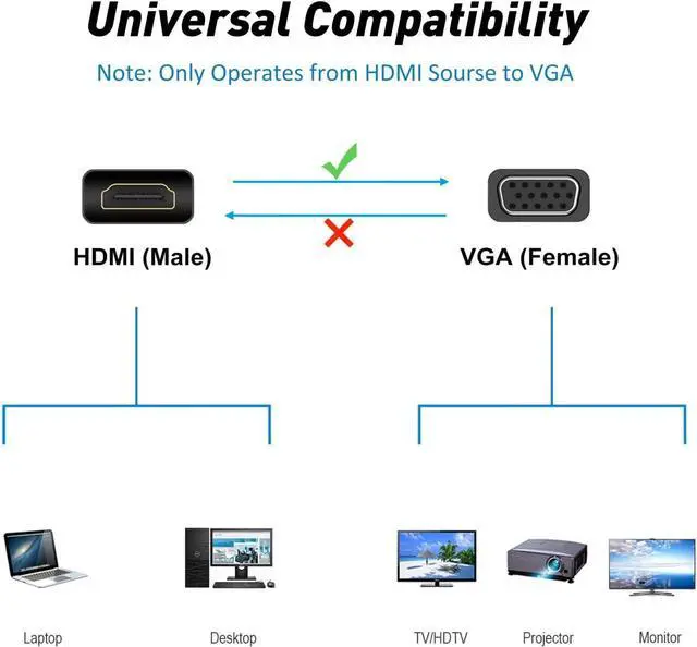 Note: It is a uni-directional adapter only converting FROM HDMI source to VGA. )Plug and PlayEasy to use no driver or software required! This HDMI to VGA converter connects a computer desktop laptop or other devices with HDMI port to a monitor projector HDTV or other devices with VGA port. Widely CompatibilityThe HDMI-VGA adapter is compatible with computer pc desktop laptop ultrabook notebook Chromebook Raspberry Pi Intel Nuc PS3 Xbox One Xbox 360 Wii U Set Top Box TV BOX or other devices with HDMI port; (NOT compatible with Blu-ray player and devices with low-power HDMI ports such as SONY PS4 MacBook Pro with Retina Display Mac mini and TV. )Protable DesignCompact and lightweight for mobility. Tuck this HDMI to VGA converter into your bag or pocket to do a business presentation with your laptop and projector or extend your desktop screen to a monitor or TV wherever you want; A VGA cable is required. 24H Service OnlineOriginated from confidence in the HDMI to VGA Adapter ensures long-time satisfaction of your purchase If any problem plase tell us through.