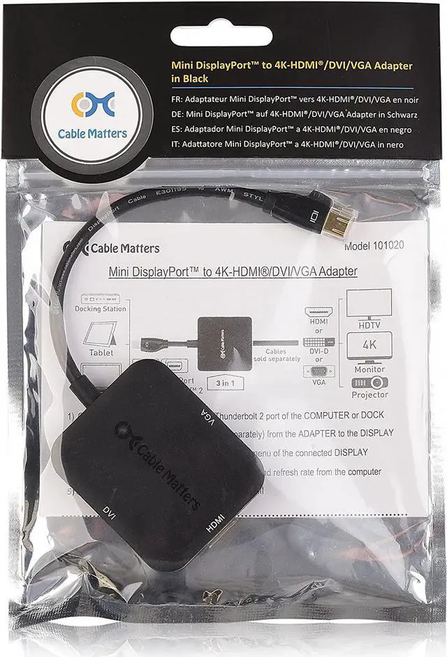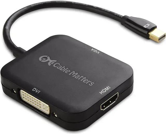 Lightweight and portable Thunderbolt to HDMI adapter for connecting a Mini DisplayPort (Mini DP or mDP) /Thunderbolt 2 port compatible computer to an HDTV monitor or projector with HDMI/DVI/VGA; A separate HDMI/DVI/VGA cable (sold separately) is required for this HDMI to Mini Displayport cable adapterMini DP to HDMI adapter transmits both audio and video from computer or tablet to HD display via HDMI; HDMI to Mini Display Port adapter supports video resolutions up to 4K via HDMI and flawless audio pass-thru for uncompressed digital 7.1 5.1 or 2 channels; Mini DisplayPort to VGA adapter supports 1080p via DVI or VGA (no audio output via DVI or VGA) Low-profile connector on the Mini Display to HDMI adapter does not block adjacent ports on your computer has molded strain-relief for long life and has ergonomically designed treads for easy plugging and unpluggingGold-plated connectors of the Mini DisplayPort to DVI adapter resist corrosion provide rigidity and improve the signal performance of the Mini Display Port to HDMI adapterCompatible with MacBook MacBook Pro MacBook Air iMac Mac mini Mac Pro; Surface Pro 4 Pro 3 Pro 2 Surfacebook (NOT Surface for Windows RT); ThinkPad X1 Carbon X230/X240s L540 T540p W540 Helix; XPS 13/14/15/17 Latitude E7240/E7440 Precision M3800; Alienware 14/17/18; Aspire R7/S7/V5/V7; Intel NUC; Zenbook; HP Envy 14/17; Google Chromebook Pixel; Zeusbook Edge X6; Toshiba Satellite Pro S500 Tecra M11/A11