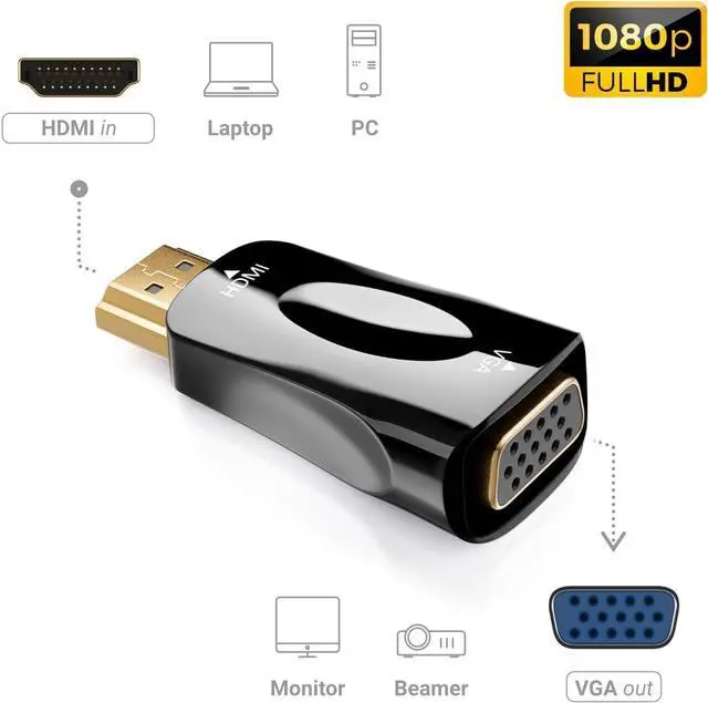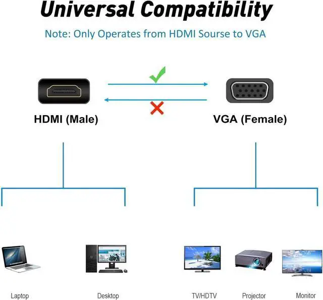 Note: It is a uni-directional adapter only converting FROM HDMI source to VGA. )Plug and PlayEasy to use no driver or software required! This HDMI to VGA converter connects a computer desktop laptop or other devices with HDMI port to a monitor projector HDTV or other devices with VGA port. Widely CompatibilityThe HDMI-VGA adapter is compatible with computer pc desktop laptop ultrabook notebook Chromebook Raspberry Pi Intel Nuc PS3 Xbox One Xbox 360 Wii U Set Top Box TV BOX or other devices with HDMI port; (NOT compatible with Blu-ray player and devices with low-power HDMI ports such as SONY PS4 MacBook Pro with Retina Display Mac mini and TV. )Protable DesignCompact and lightweight for mobility. Tuck this HDMI to VGA converter into your bag or pocket to do a business presentation with your laptop and projector or extend your desktop screen to a monitor or TV wherever you want; A VGA cable is required. 24H Service OnlineOriginated from confidence in the HDMI to VGA Adapter ensures long-time satisfaction of your purchase If any problem plase tell us through.