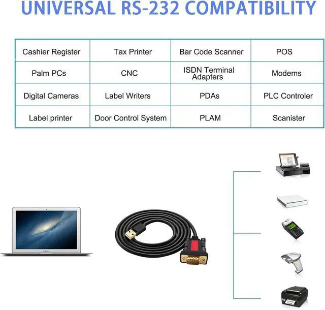 ?? Provide the connection between USB and the traditional RS-232 serial port. Supports remote wake up and power management.?? Compatible with most GPS modems printers s digital cameras ISDN Terminal Adapters label writers palm PCs PDAs cashier register CNC PLC controller tax printer POS bar code label printer and more devices with DB9 SERIAL ports.?? Use latest Prolific PL2303 chipset compatible with MAC OS Windows Android Linux system USB Device. For first time to use you need to install the driver. The driver is available in enclosed CD. You can also to download the latest driver and the product manual from the link we provide.