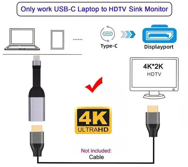 Compatible with Type-C USB-C source to Displayport 4K sink displays output; Not Compatible with Displayport source to Type-C USB-C sink output.
