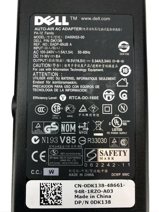 Genuine Dell DA65NS3-00 AC Adapter Power Supply 19.5V 3.34A With Power Cord OEM