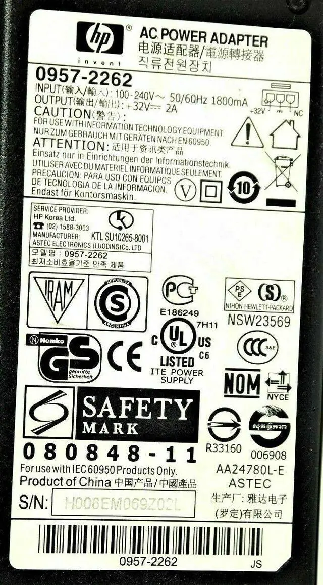 Genuine HP AC Power Adapter Power Supply 32V 2A 2000mA 0957-2262 080814-11 3 pin for Officejet Printers Wireless Pro 8000 8500A Plus Pro 8500 A909A A909G A909N A910nN G K etc w/PC OEM