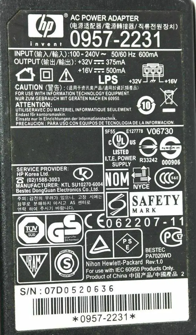NEW Genuine HP 16V/32V AC Adapter Model 0957-2231 32V/16V 375mA/500mA w/Cord OEM