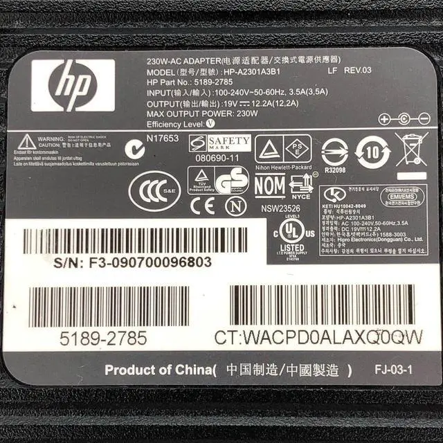 Genuine 230W HP AC Adapter 19V 12.2A Model HP-A2301A3B1 P/N 5189-2785 w/Cord OEM