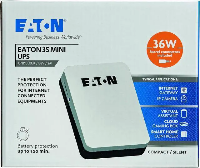 Eaton 3S mini UPS: safe operating continuity for connected devices in the event of power outages with an inexpensive and compact DC UPS, the Internet router, IP cam"Eaton 3S mini UPS: This mini UPS is the ideal and affordable protection against power outages for the FRITZ!Box or other Internet routers, IP cameras, home assistants, smart home controllers and external hard drives. DESIGNED TO KEEP YOU CONNECTED Keep your critical connected devices (FRITZ!Box, Internet gateway, IP camera, smart home controller, personal assistant, etc.) operating in the event of a power outage. Keep the ability to remotely control your connected devices even in the event of a power failure (IP cameras) including surge protection by internal circuit. Adaptable: Choose from 4 output voltages (factory set to 12V) compatible with the power supply requirements of critical applications, and 4 output plug types to adapt to your device needs. Simple: Easy to read LED indicator with information about the selected output voltage and remaining battery capacity. Cold start function for using the 3S Mini as a power bank. Compact and quiet: 3S Mini replaces your device's included power supply to ensure power without additional devices. The super compact, noiseless and elegant design ensures that the 3S Mini fits well into your home or office. "eras, home assistants and smart controllers. DESIGNED TO KEEP YOU CONNECTED Keep your critical connected devices (Internet gateway, IP camera, smart home controller, personal assistant, etc.) operating in the event of a power outage. Keep the ability to remotely control your connected devices without power failure (IP cameras). Overcurrent protection by internal circuit. Adaptable: Choose from 4 output voltages compatible with the power supply requirements of critical applications and 4 output plug types to adapt to your device needs. Simple: Easy to read LED indicator with information about the selected output voltage and remaining battery capacity. Cold start function to use the 3S Mini as a battery bank. Compact and quiet: 3S Mini replaces your device's included power supply to ensure power without additional devices. The super compact, quiet and elegant design ensures that the 3S Mini fits well into your home or bus