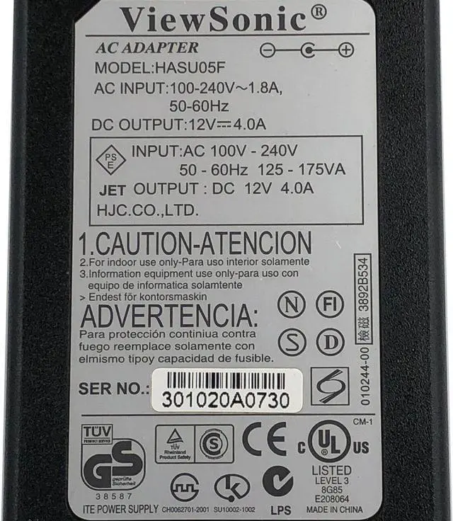 Genuine ViewSonic HASU05F AC Adapter 12V 4A Power Supply 4.8x1.7 mm w/Cord