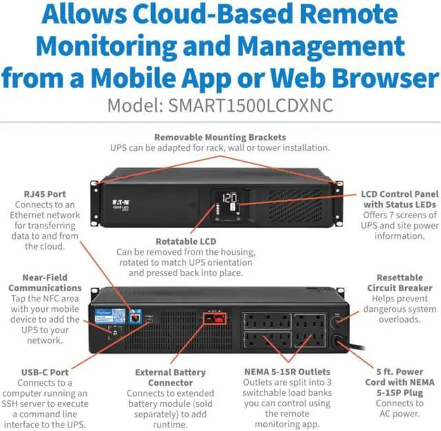 CLOUD-ENABLED ONLINE UPS: Manage your tech from anywhere. Online Battery Backup lets you receive alerts through email or text, silence alarms, shutdown & restart equipment, and control outlet banks through web browser or Eaton's free Brightlayer app.