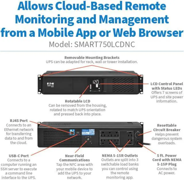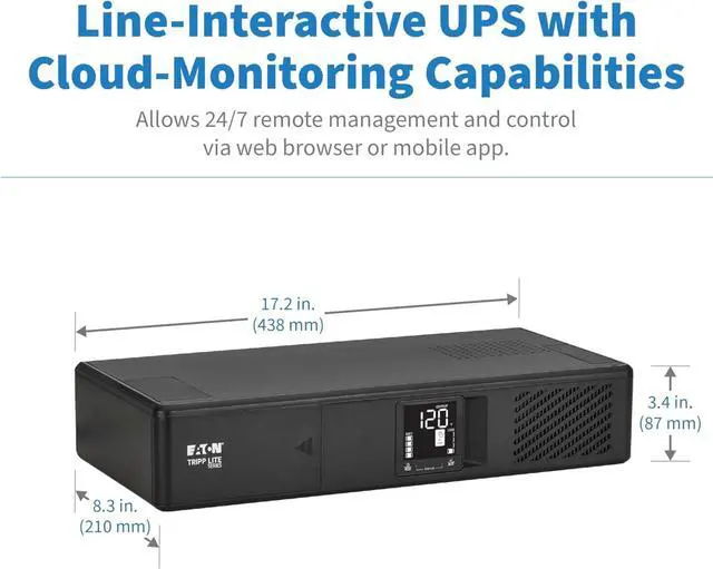 CLOUD-ENABLED ONLINE UPS: Manage your tech from anywhere. Online Battery Backup lets you receive alerts through email or text, silence alarms, shutdown & restart equipment, and control outlet banks through web browser or Eaton's free Brightlayer app.