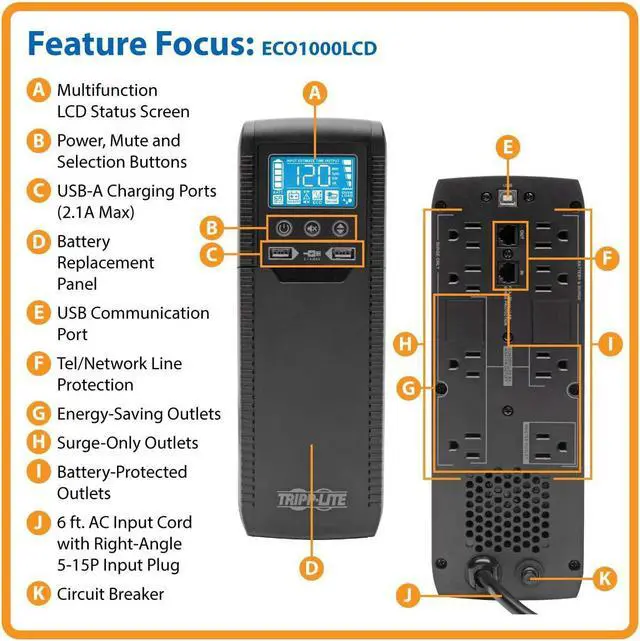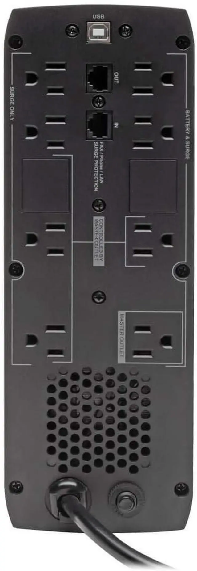 SMART UNINTTERUPTED POWER SUPPLY: Features 8 outlets. Four outlets feature both UPS back up battery & surge protection. ECO power-saving option features 3 ECO outlets that turn off automatically when the Battery Backup Master Outlet device is powered down or in sleep mode. Surge spike protection features 316 joules of supression rating. RJ45 port protect a standard dial-up/phone connection or 100Mb Ethernet line connection from data line surges. Two USB charging ports share up to 5V 2.1A of maximum charge.