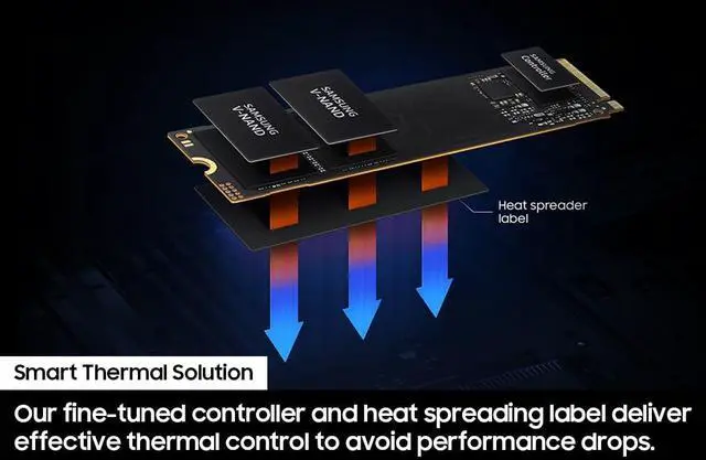 SMART THERMAL CONTROL: Now you can ramp things up without overheating the system. Samsungs fine tuned controller and heat spreading label deliver effective thermal control to avoid sudden performance drops mid project. It cools things down even when things are running high, so your hard earned checkpoints are saved.
