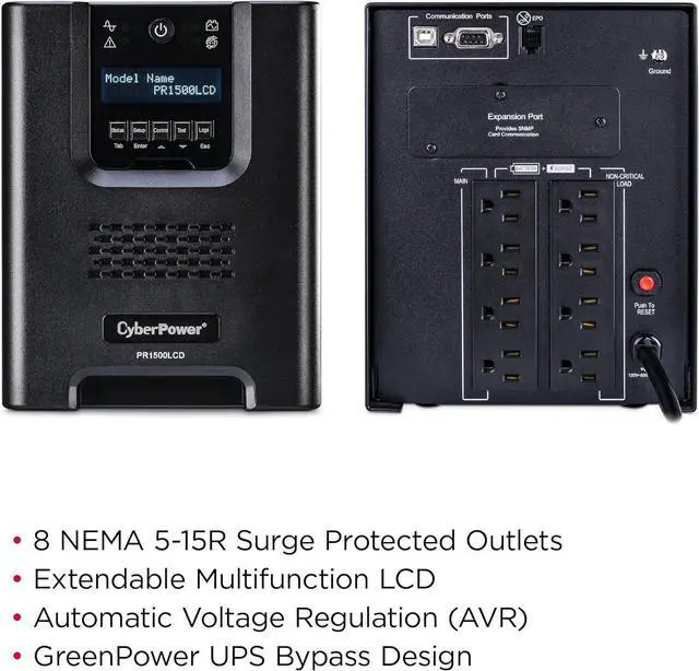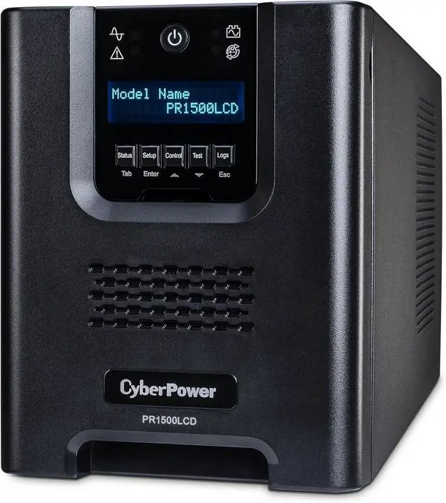 A mini-tower UPS with line interactive topology, the CyberPower smart app Sinewave PR1500LCD Provides battery backup, power protection (using sine wave output), and surge protection for corporate servers, department servers, storage appliances, network devices, and telecom installations requiring Active PFC power source compatibility. The PR1500LCD uses automatic voltage regulation (AVR) to correct minor power fluctuations without switching to battery power, which extends battery life. Aver is essential in areas where power fluctuations occur frequently. The PR1500LCD comes with a three-year and a $375,000 connected equipment.