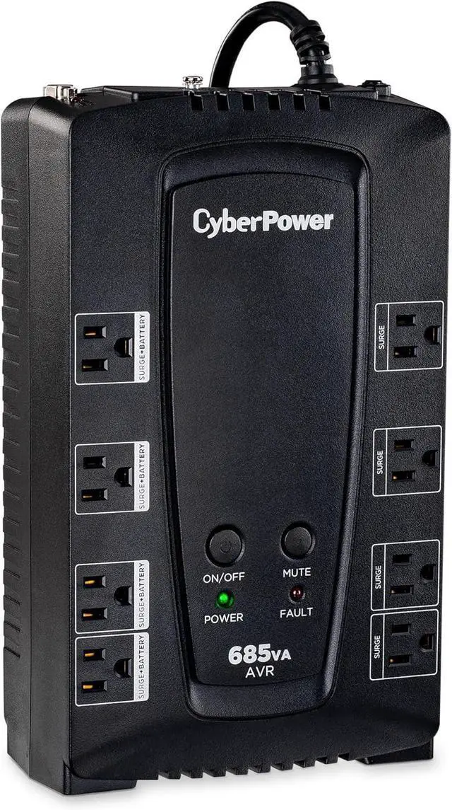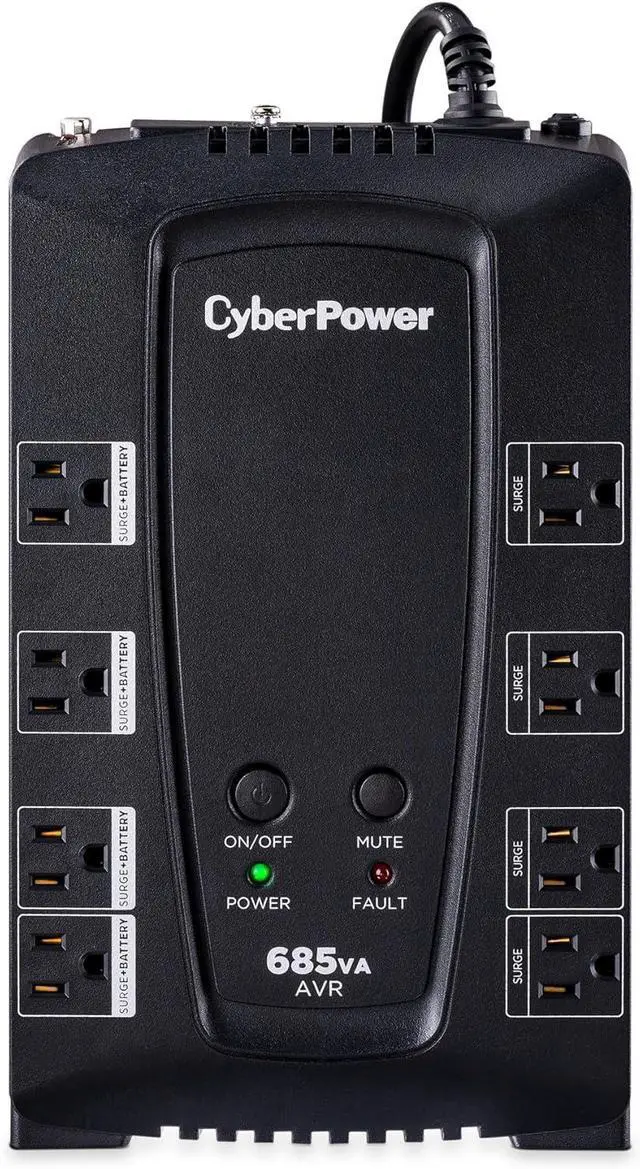 The CyberPower CP685AVRG uninterruptible power supply (UPS) system provides battery backup and surge protection for lightning-induced surges and other power events that can damage electronic equipment. This UPS, with line-interactive topology, uses simulated sine wave output to deliver battery backup to power connected electronics during a utility power failure. The unit has enough runtime to perform a graceful shutdown to protect against the loss of data and damage to valuable desktop computers, workstations, networking devices, and home entertainment systems. The CP685AVRG uses Automatic Voltage Regulation (AVR) to correct minor power fluctuations without switching to battery power. AVR is essential in areas where power fluctuations occur frequently, and it helps to extend the units battery life. CyberPower designed the CP685AVRG to minimize noise for a quieter work environment and run efficiently to reduce power consumption. With a $125,000 lifetime connected equipment guarantee and a three-year warranty, you can trust CyberPowers commitment to the quality of this battery backup with surge protection.