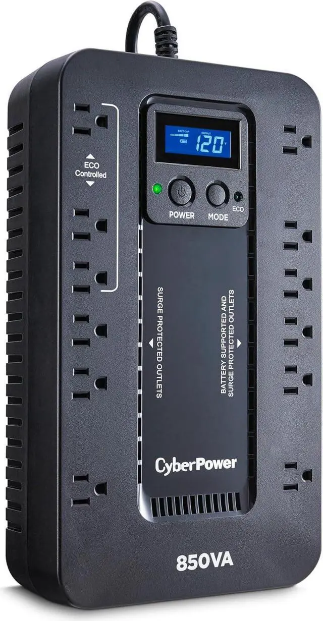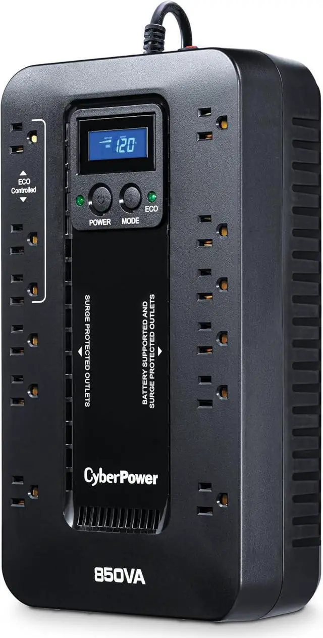 A compact UPS with standby topology, the CyberPower Ecologic EC850LCD provides battery backup (using simulated sine wave output) and surge protection for desktop computers, workstations, networking devices, and home entertainment systems. During power interruptions, the EC850LCD offers reliable power protection and battery backup. When the battery backup detects that the computer is off or in sleep mode, computer peripherals connected to the ECO Mode, surge protected outlets will be automatically turned off, reducing power usage and lowering energy costs USB connection required. The EC850LCD comes with a three-year warranty (including coverage of batteries) and a $100,000 Connected Equipment Guarantee.