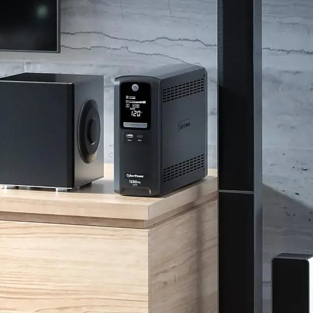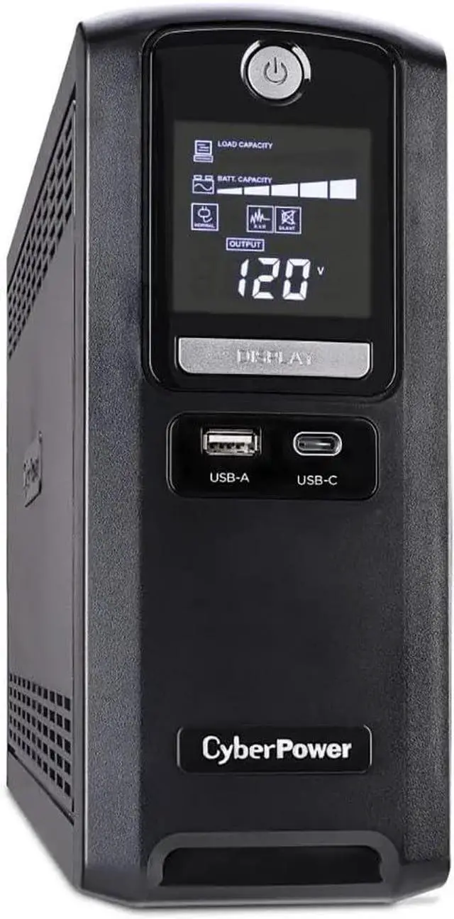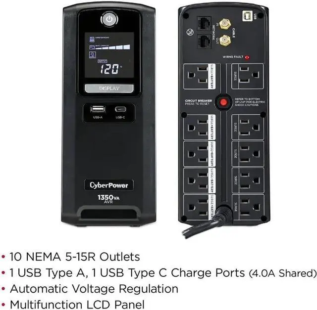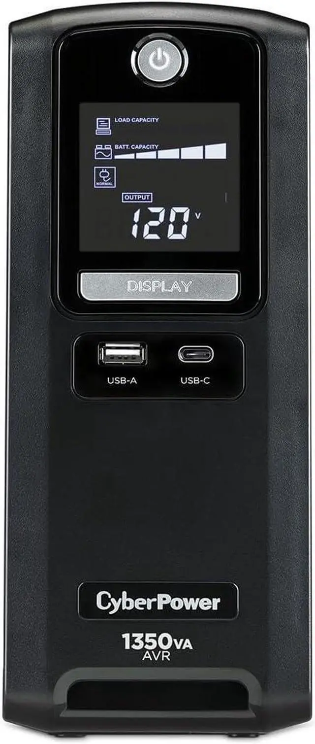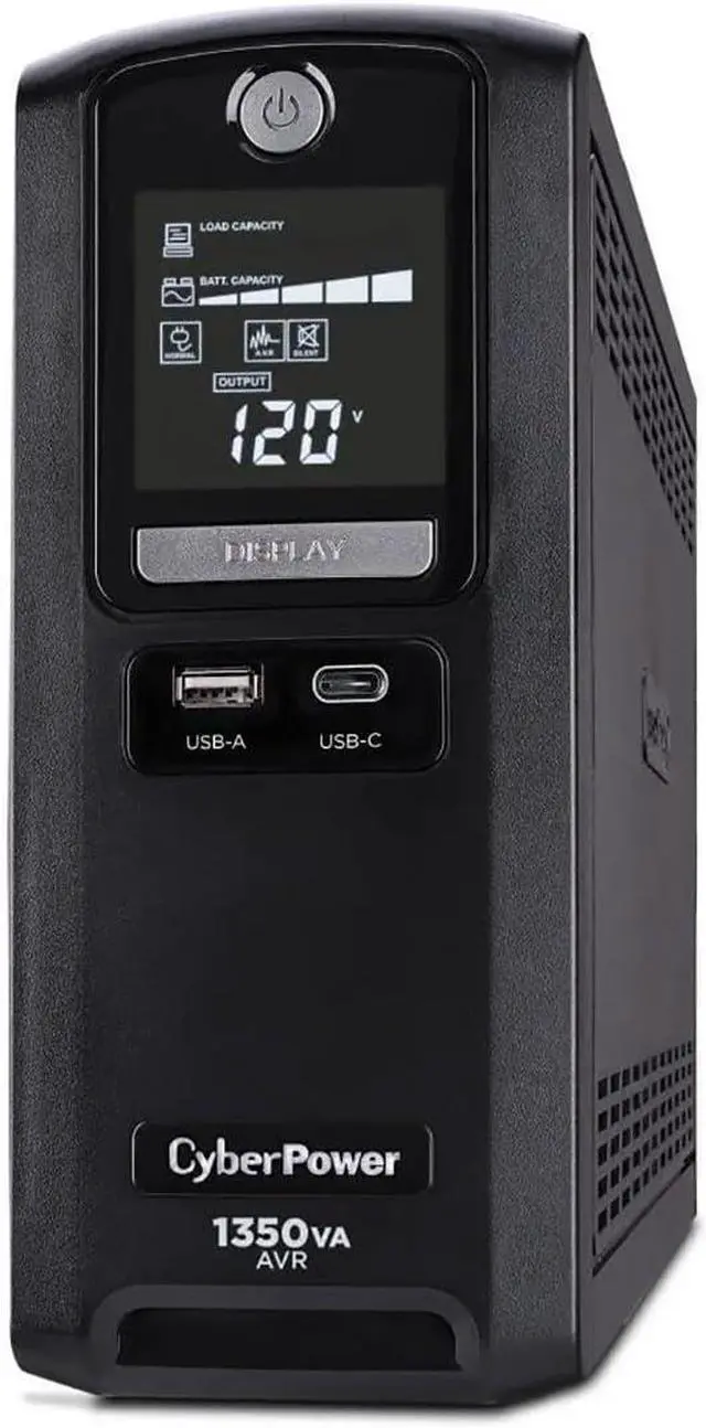 A mini-tower UPS with line interactive topology, the CyberPower Intelligent LCD CST135UC provides battery backup (using simulated sine wave output) and surge protection for desktop computers, workstations, networking devices, and home entertainment systems. The CST135UC uses Automatic Voltage Regulation (AVR) to correct minor power fluctuations without switching to battery power, which extends battery life. AVR is essential in areas where power fluctuations occur frequently.Two USB charge ports (one Type-A and one Type-C) power portable devices such as mobile phones and tablets, even during a utility power failure. The CST135UC comes with a three-year warranty (including coverage of batteries) and a $500,000 Connected Equipment Guarantee.Battery BackupSupplies power long enough for equipment to properly shut down when utility power fails. Helps prevent loss of data and minimizes the component stress caused by a hard shutdown.Surge ProtectionDiverts excess voltage away from sensitive electronic equipment during an AC power surge or power spike to prevent damage.Automatic Voltage Regulation (AVR)AVR increases the AC power and maintains a safe voltage level without switching to battery mode and conserves battery life.Multifunction LCD PaneDisplays immediate, detailed information on the battery backup and power conditions, alerting users to potential problems before they can affect critical equipm