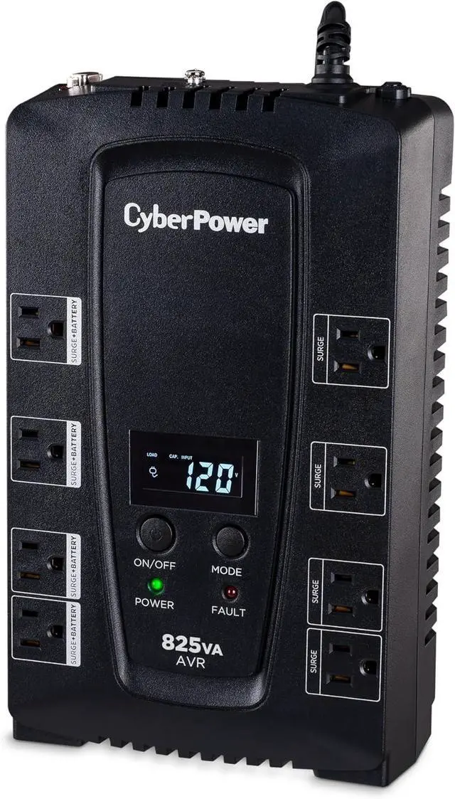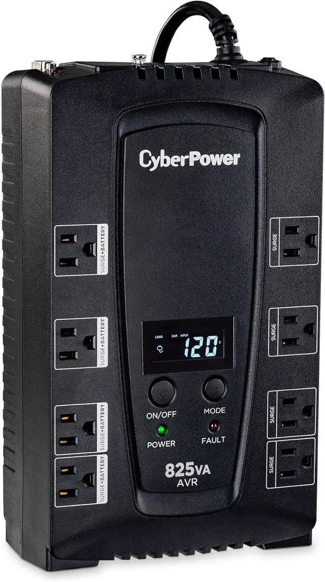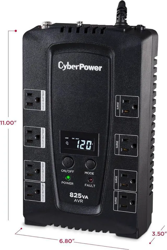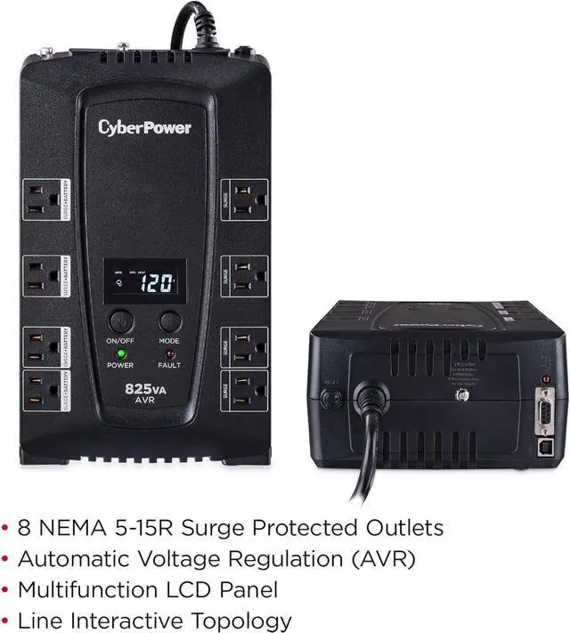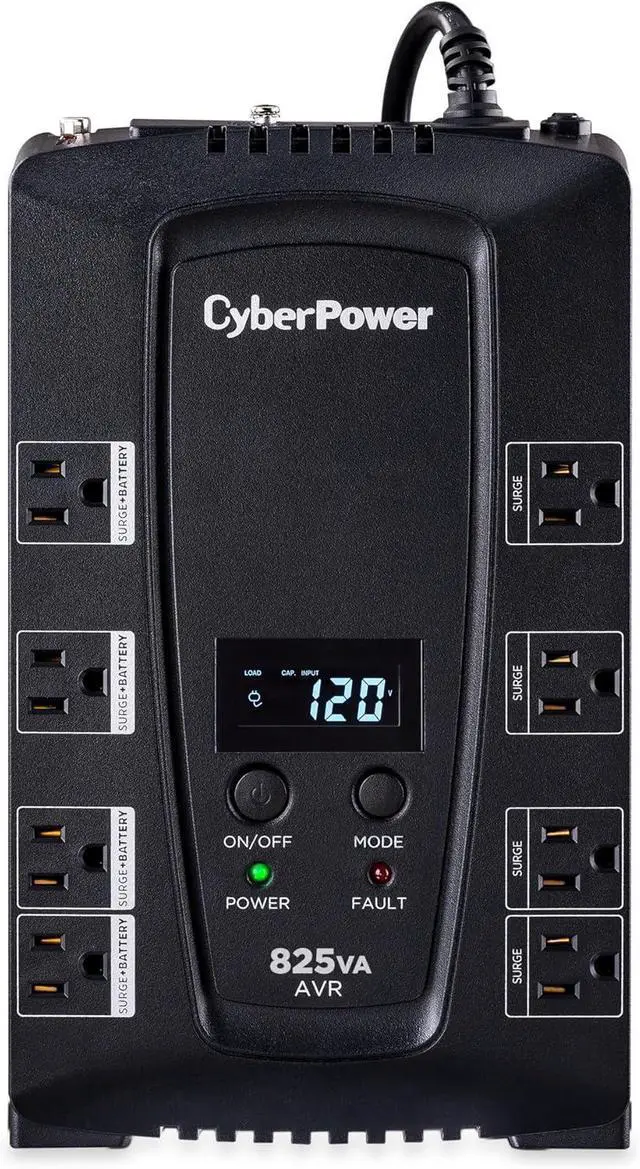 A compact desktop UPS with line interactive topology, the CyberPower Intelligent LCD CP825LCD provides battery backup (using simulated sine wave output) and surge protection for desktop computers, workstations, networking devices, and home entertainment systems. During power interruptions, the CP825LCD offers reliable power protection and battery backup. The CP825LCD comes with a three-year warranty (including coverage of batteries) and a $200,000 Connected Equipment Guarantee.
