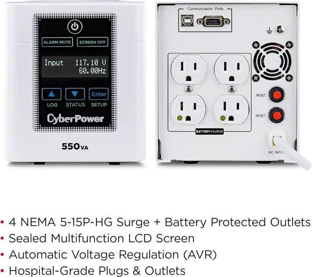 The CyberPower M1100XL medical-grade UPS delivers clean, consistent backup power to sensitive medical equipment in hospitals and healthcare facilities. Designed for use in patient care vicinities, the M1100XL has been tested to meet all UL 60601-1 requirements, and includes hospital-grade plugs and outlets. The M1100XL also includes a built-in isolation transformer to minimize the current leakage and eliminate line noise, a tip-resistant mini-tower design, replaceable batteries, and a sealed, spray-resistant LCD panel. The M1100XL medical-grade UPS is covered by a three-year warranty (including coverage of batteries) and a $400,000 Connected Equipment Guarantee. NOTE: This UPS is not intended for use in critical care or life support applications.
