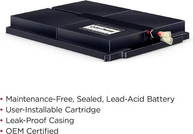 The RB0690X4 UPS Replacement Battery Cartridge restores life to CyberPower UPS systems that have weak or completely depleted internal batteries. The RB0690X4 contains four 6V/9AH replacement batteries, certified to meet or exceed original manufacturer specifications. These leak-proof, sealed lead-acid batteries never require replacement fluid. The pre-assembled cartridge installs easily in your CyberPower UPS system and is shipped with reusable packaging for delivering expired batteries to a suitable recycling center. The RB0690X4 comes with instructions, recycling information, and an eighteen-month warranty. UPS Compatibility: OR1500LCDRM1U.