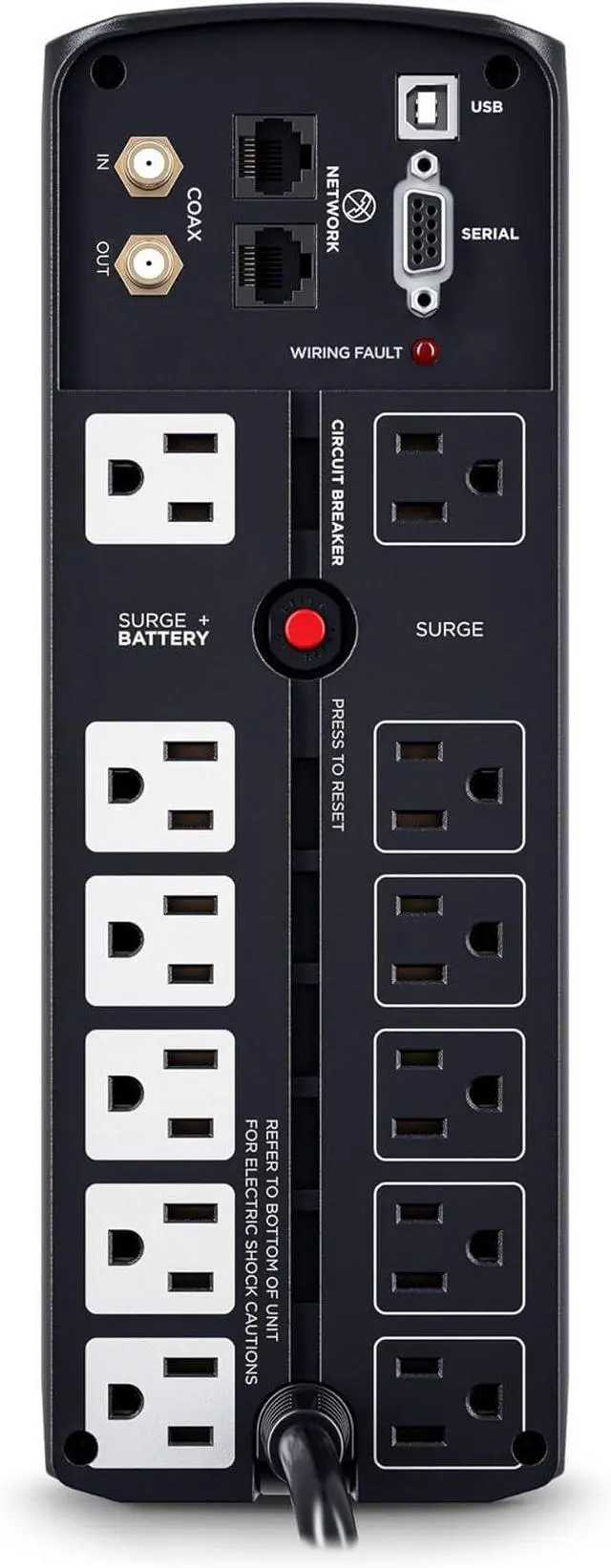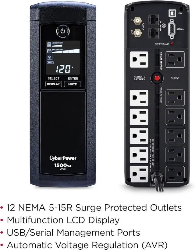 A mini-tower UPS with line interactive topology, the CyberPower Intelligent LCD CP1500AVRLCDTAA provides battery backup (using simulated sine wave output) and surge protection for desktop computers, workstations, networking devices, and VoIP phone systems. The CP1500AVRLCDTAA uses Automatic Voltage Regulation (AVR) to correct minor power fluctuations without switching to battery power, which extends battery life. AVR is essential in areas where power fluctuations occur frequently. The CP1500AVRLCDTAA comes with a three-year warranty (including coverage of batteries), a $500,000 Connected Equipment Guarantee, and complies with the U.S. Trade Agreement Act (TAA).