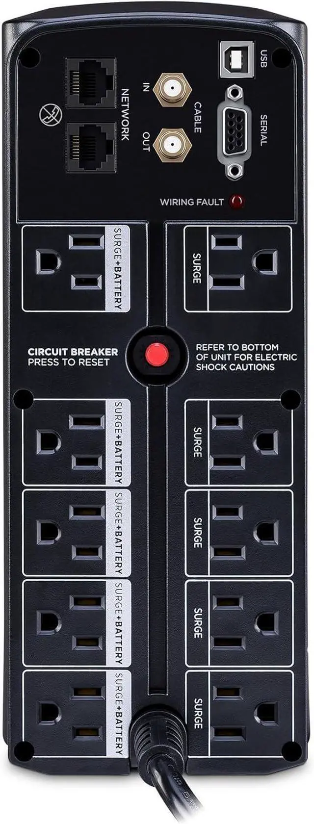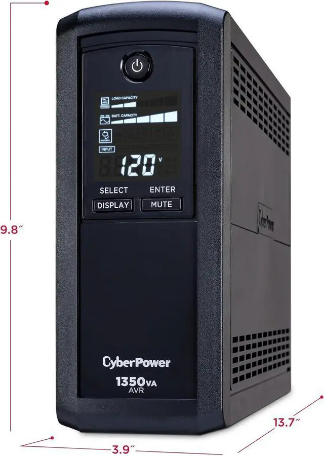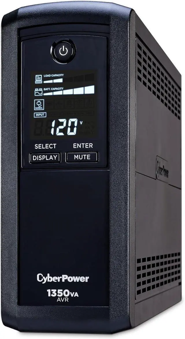A mini-tower UPS with line interactive topology, the CyberPower Intelligent LCD CP1350AVRLCD provides battery backup (using simulated sine wave output) and surge protection for desktop computers, workstations, networking devices, and home entertainment systems. The CP1350AVRLCD uses Automatic Voltage Regulation (AVR) to correct minor power fluctuations without switching to battery power, which extends battery life. AVR is essential in areas where power fluctuations occur frequently. The CP1350AVRLCD comes with a three-year warranty (including coverage of batteries) and a $500,000 Connected Equipment Guarantee.