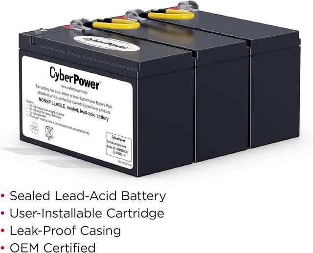 The RB1290X3B UPS Replacement Battery Cartridge restores life to CyberPower UPS systems that have weak or completely depleted internal batteries. The RB1290X3B contains three 12V/9Ah batteries, certified to meet or exceed original manufacturer specifications. This leak-proof, sealed lead-acid battery never requires replacement fluid. The pre-assembled cartridge installs easily into your CyberPower UPS system and is shipped with reusable packaging for delivering expired batteries to a suitable recycling center. The RB1290X3B comes with instructions, recycling information, and an eighteen-month warranty. UPS Compatible: M1100XL.