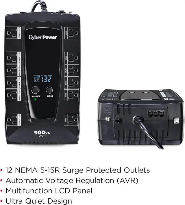 900VA/480W Intelligent LCD Battery Backup Uninterruptible Power Supply (UPS) System uses simulated sine wave output to safeguard desktop computers, workstations, networking devices, and home entertainment equipment