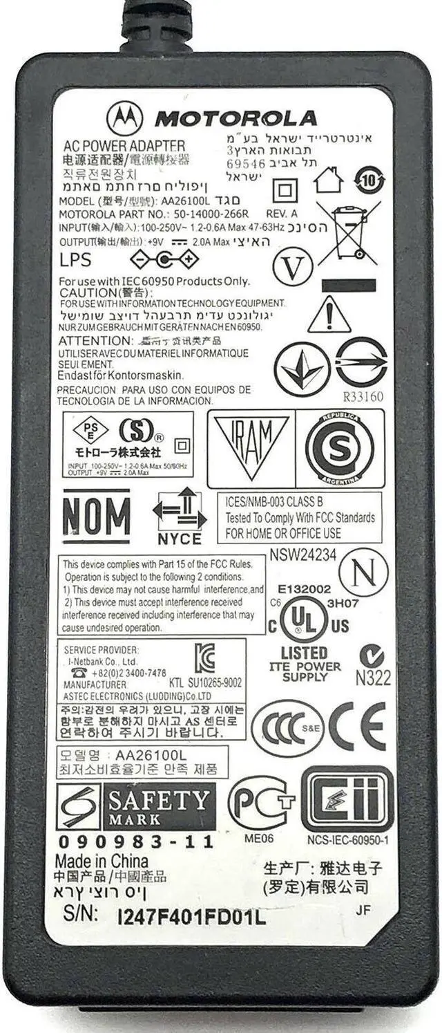 Genuine Motorola AA26100L AC/DC Power Supply Adapter 9V 2A 18W OEM n/PC