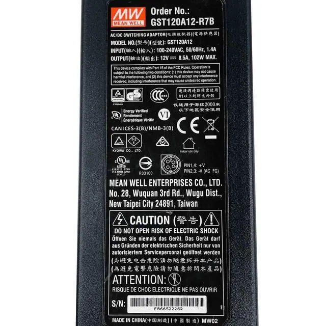 Genuine Mean Well GST120A12 AC/DC Switching Adapter 4-Pin 12V 8.5A 102W w/P.Cord
