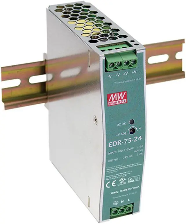 AC to DC Switching DIN Rail Power Supply 12 Volts 6.3 Amps 75.6 Watts 12 Volts 6.3 Amps Specifications Output Power (W): 75.6 Size (L x W x H) inches: 1.26 X 4.93 X 4.02 Ripple & Noise (mV p-p): 80 Load Regulation (±): 1% Line Regulation (±): 0.5% Efficiency: 85.5% Agency Approvals: UL/CUL/TUV/CE/CB Universal AC input / Full range Can be installed on DIN rail TS-35/7.5 or 15 Protections: short circuit, over voltage, over temperature, overload Cooling by free air convection UL 508 (industrial control equipment) approved EN61000-6-2(EN50082-2) industrial immunity level 100% full load burn-in test 2 year warranty For more 12V power supplies . Detailed Specifications: Primary Output Voltage (VDC): 12 Output Current (A): 6.3 Maximum Output Power (W): 75.6 Family: EDR-75 Input Voltage (VAC): 90 to 264 Input Frequency: 47 to 63 Maximum Input Current (A): 1.45 Output Connector Type: Screw Terminal Efficiency (%): 85.5 Operating Temperature-Min (Cell): -20 Operating Temperature-Max (Cell): 60 Length (inch): 1.26 Width (inch): 4.93 Height (inch): 4.02 Agency Approvals: UL/CUL/TUV/CB/CE Color: Silver Style: DIN.