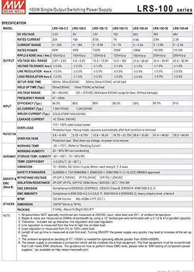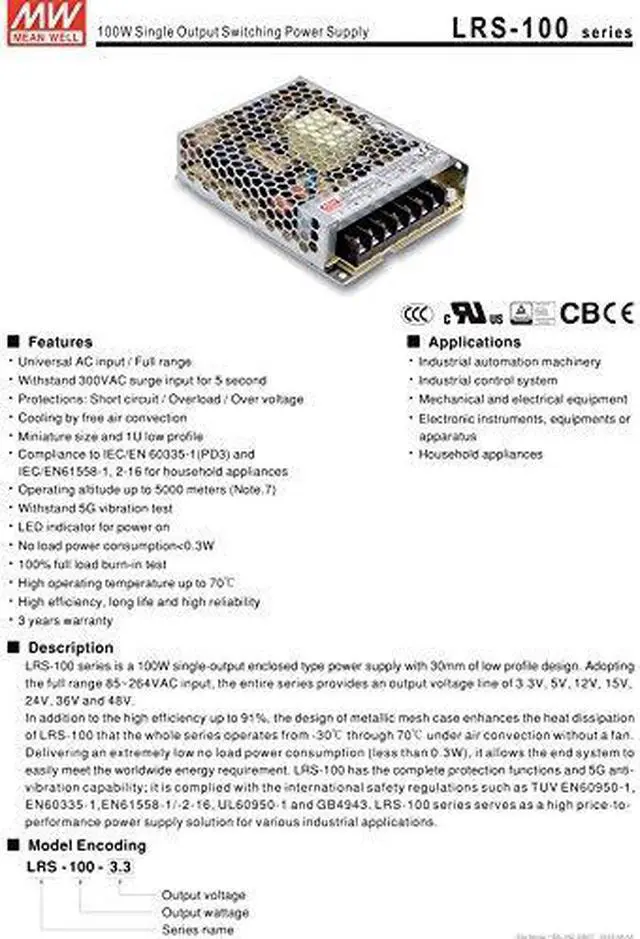 The Mean Well LRS power supply series is offered in 35, 50, 75, 100, 150, 200 and 350 Watt models. These open frame power supplies take AC line voltage input and provide constant DC output voltage lines of 5V, 12V, 15V, 24V, 36V and 48V. These single-output enclosed type power supplies sit at just 30mm tall for a low profile design you can easily mount within your application.