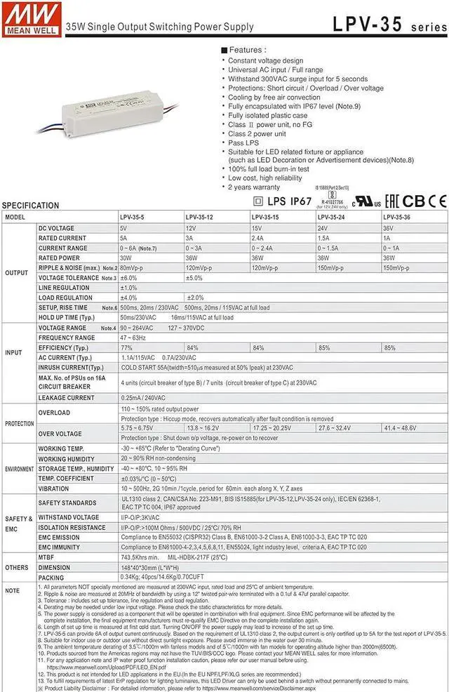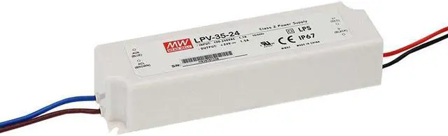 Mean Well's LP Constant Voltage LED Drivers run off line voltage (90-264). We offer the LP series in 20, 35, 60 and 100 Watt models that act as a switching device to turn AC input voltage into a single-output DC voltage between 5 and 48V. These AC/DC power supplies come in a fully isolated plastic case that is IP67 rated so you can use outdoors without worrying about moisture getting inside. The slim, butterstick design allows you to work this into your lighting design easily and seamlessly. The wire connections are UL rated and run from 14-18 AWG depending on the Wattage you select (see data sheets below for specifics). If you have specifications and standards for your project, you should know this is a class 2 power unit. This low cost, high reliability unit is just what you need for large LED arrays needing a constant voltage supply.