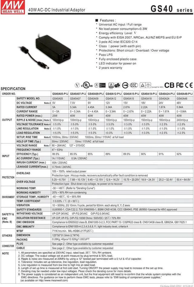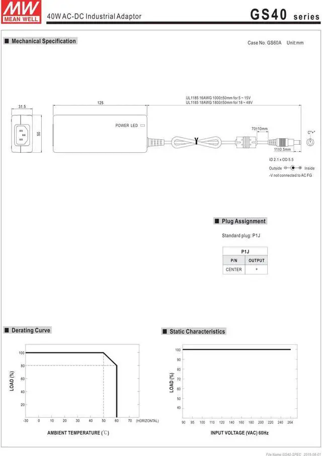 Mean Well GS40A12-P1J Power Supply, Switching, Table Top, Regulated, 40 Watt, 4.9" L x 2.0" W x 1.3" H