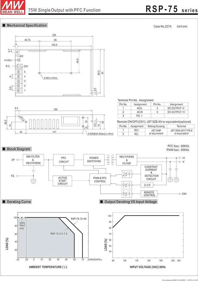 MW Mean Well RSP-75-15 15V 5A 75W Single Output with PFC Function Power Supply