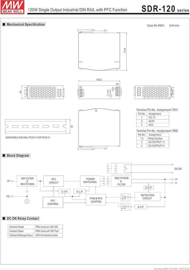 MW Mean Well SDR-120-12 12V 10A 120W Single Output Industrial DIN RAIL with PFC Function Power Supply